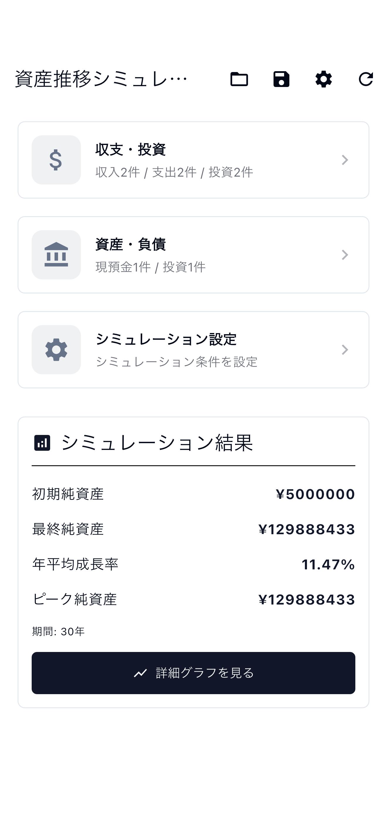 「資産推移シミュレーター」は、収支・資産・負債の情報をもとに将来の純資産を予測するアプリです。